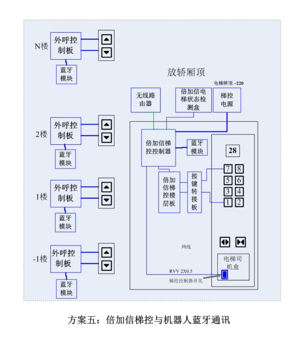 (1)机器人在电梯外,通个蓝牙连接发送指令倍加信梯控系统,系统自动点亮上楼或下楼按键,实现呼梯功能。