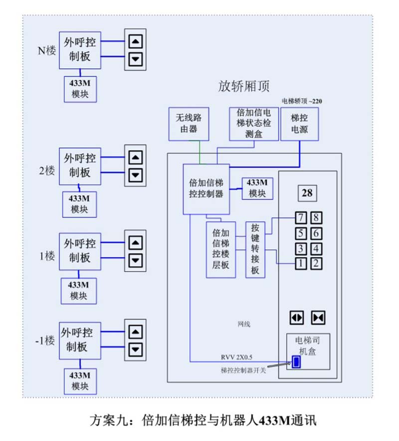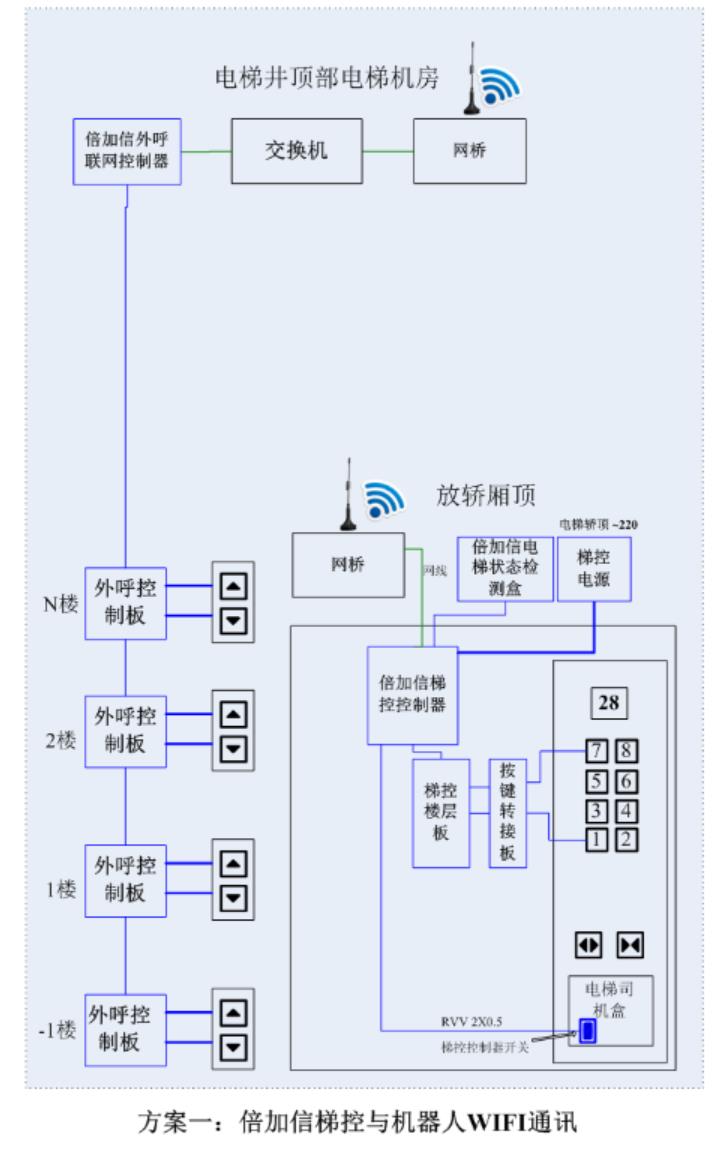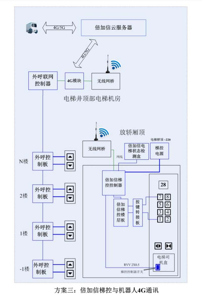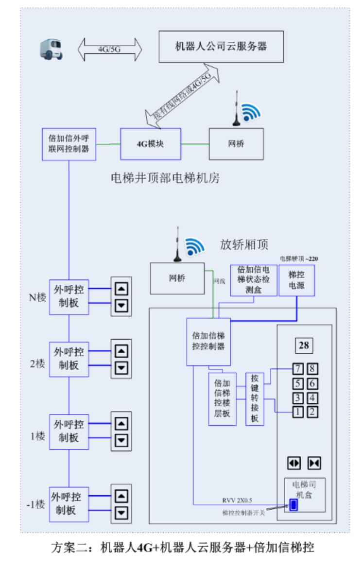 (1)机器人在电梯外,通个Wifi或4G网络发送指令给倍加信梯控平台,倍加信梯控云平台收到指令后,将指令发给倍加信梯控系统,倍加信梯控系统自动点亮上楼或下楼按键,实现呼梯功能。