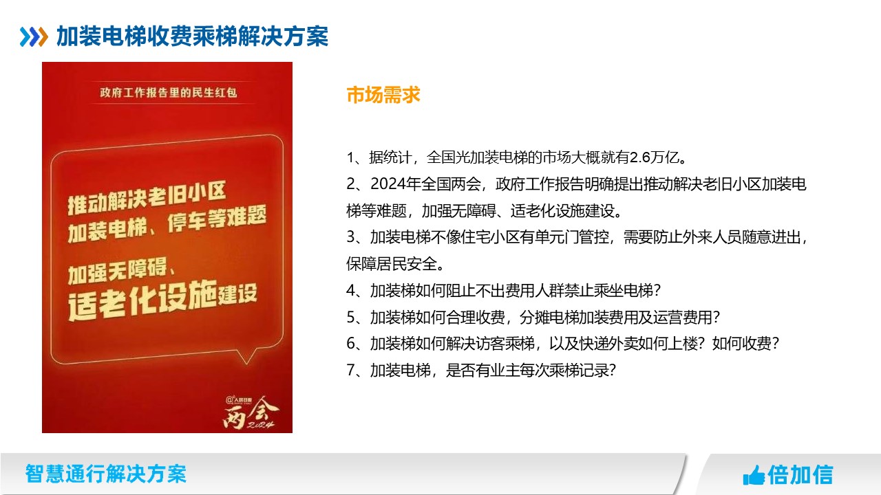 老旧小区没有电梯,上下楼难一直困扰居民生活,2024年全国两会,政府工作报告明确提出推动解决老旧小区加装电梯等难题,加强无障碍、适老化设施建设,加装电梯需要安装梯控设备需求大,功能不同于普通梯控系统。