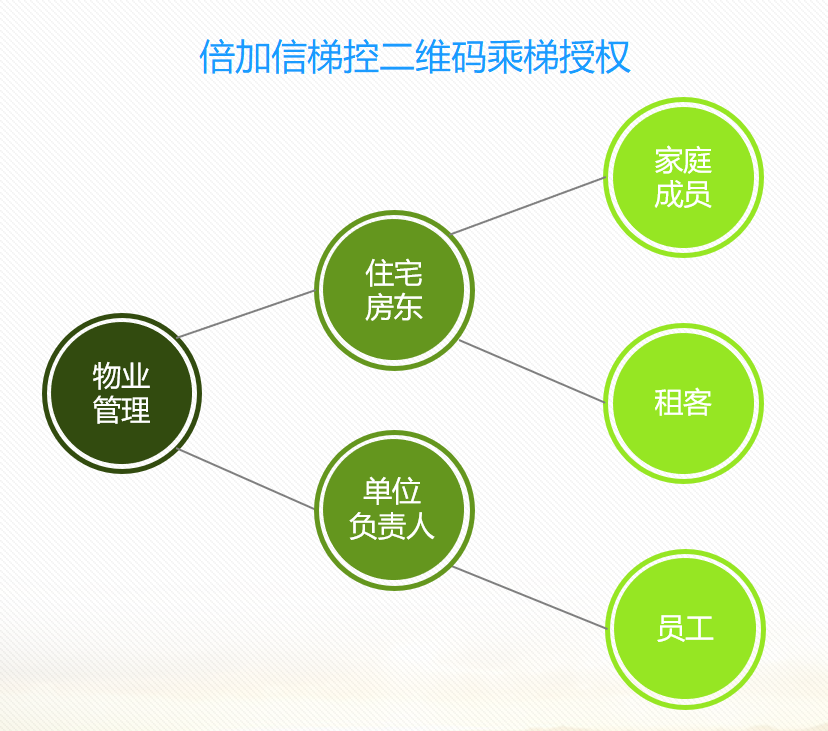 业主乘梯: (1)打开手机小程序、公众号、APP等,点击业主二维码,然后扫码乘梯,单个楼层权限扫码可直达楼层,有多个楼层权限需按键。 (2)业主二维码每次打开手机时候动态生成,可有效防止被盗用。 访客乘梯: (1)业主打开手机小程序、公众号、APP等,直接一键分享二维码给访客,访客微信或者QQ打开链接后显示二维码,进入电梯刷二维码可直达业主所在楼层。 (2)访客二维码信息包含了有效期、乘梯楼层等权限,过期自动失效。