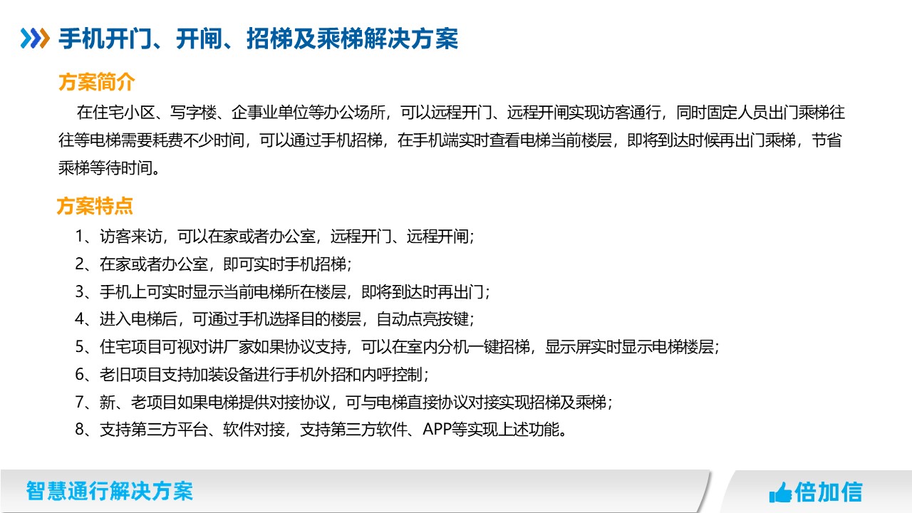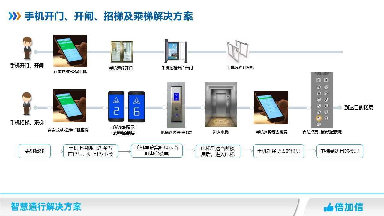 在住宅小区、写字楼、企事业单位等办公场所,可以远程开门、远程开闸实现访客通行,同时固定人员出门乘梯往往等电梯需要耗费不少时间,可以通过手机招梯,在手机端实时查看电梯当前楼层,即将到达时候再出门乘梯,节省乘梯等待时间。