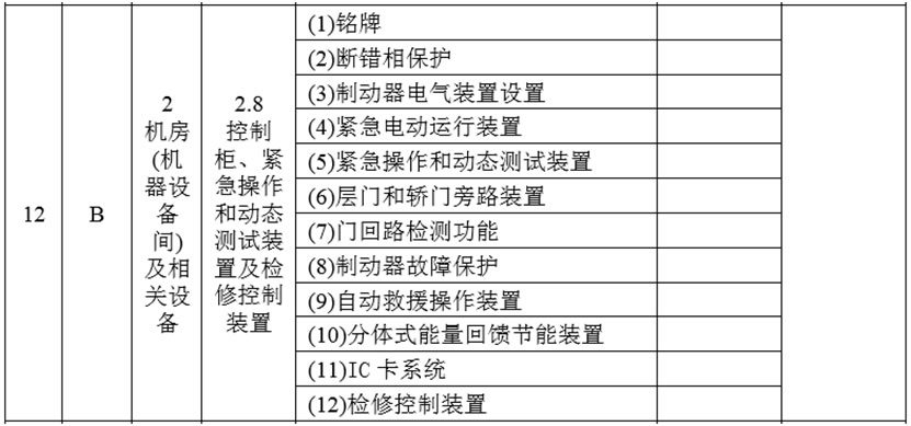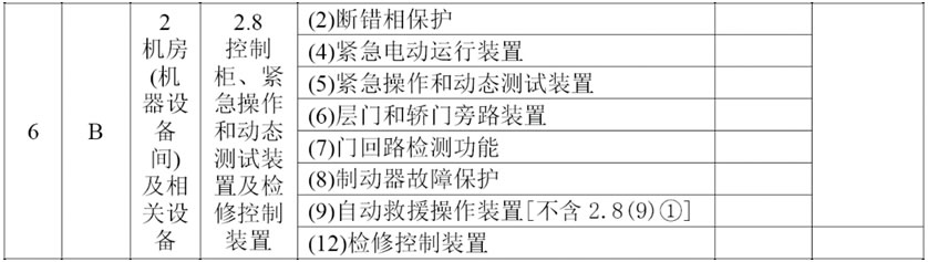(4)将2.8项的项目及类别调整为“控制柜、紧急操作和动态测试装置及检修控制装置B”,在检验内容与要求中增加:
