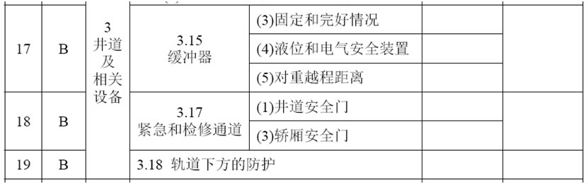 (17)增加3.18项,项目及类别为:“轨道下方的防护 B”,检验内容与要求为:“如果人员可以进入电梯运行轨道的下方,应当设置无孔的防护隔障,以挡住和收纳可能从斜行电梯上掉落的碎片或者零件”;