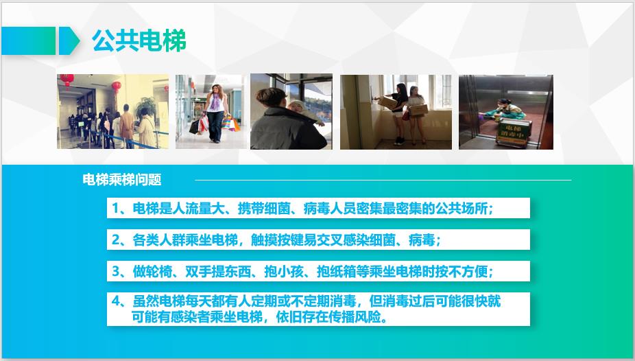 (2)各类人群乘坐电梯,触摸按键易交叉感染细菌、病毒;