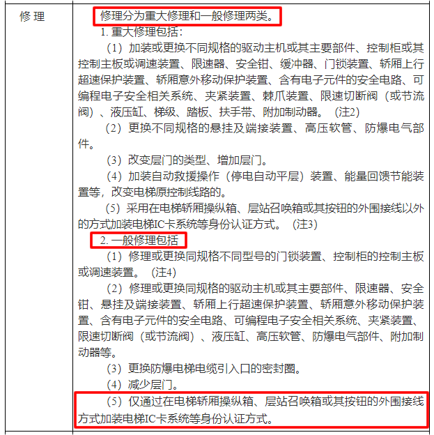 1. 重大修理包括:(5)采用在电梯轿厢操纵箱、层站召唤箱或其按钮的外围接线以外的方式加装电梯IC卡系统等身份认证方式。