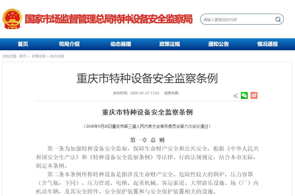 《重庆市特种设备安全监察条例》2008年9月26日重庆市第三届人民代表大会常务委员会第六次会议通过