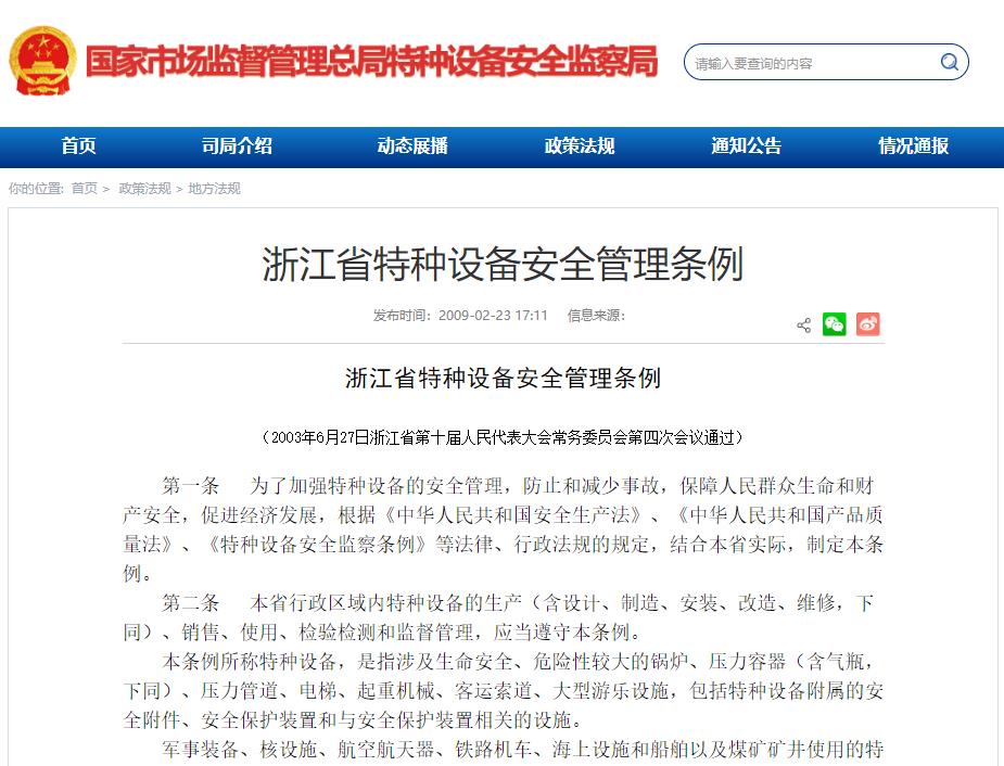 《浙江省特种设备安全管理条例》2003年6月27日浙江省第十届人民代表大会常务委员会第四次会议通过