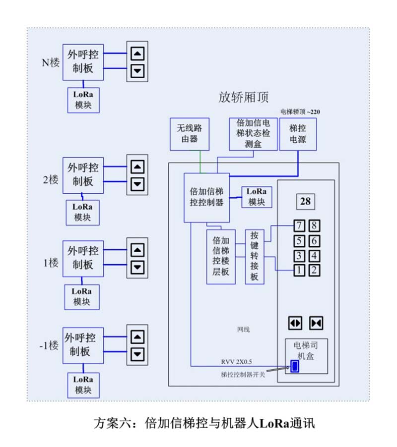 (1)机器人进入电梯后,通过LoRa通讯发送给倍加信梯控系统,系统自动点亮对应楼层按键,比如发去6楼指令,则6楼按键自动点亮,电梯送机器人员到6楼。