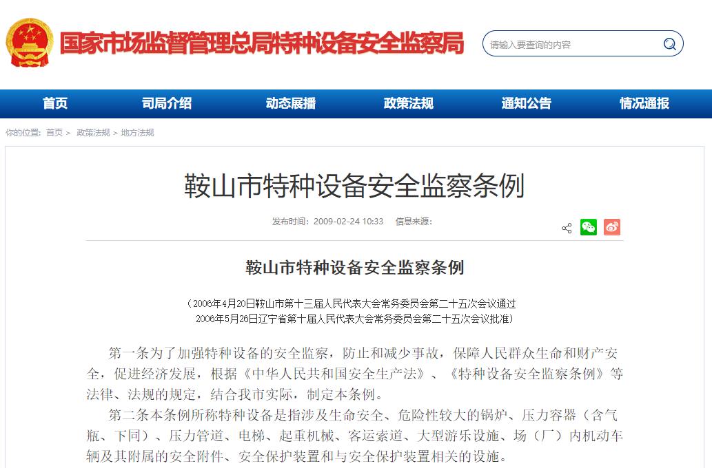 鞍山市特种设备安全监察条例