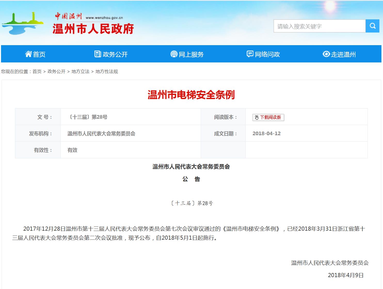 2017年12月28日温州市第十三届人民代表大会常务委员会第七次会议审议通过的《温州市电梯安全条例》,已经2018年3月31日浙江省第十三届人民代表大会常务委员会第二次会议批准,现予公布,自2018年5月1日起施行。