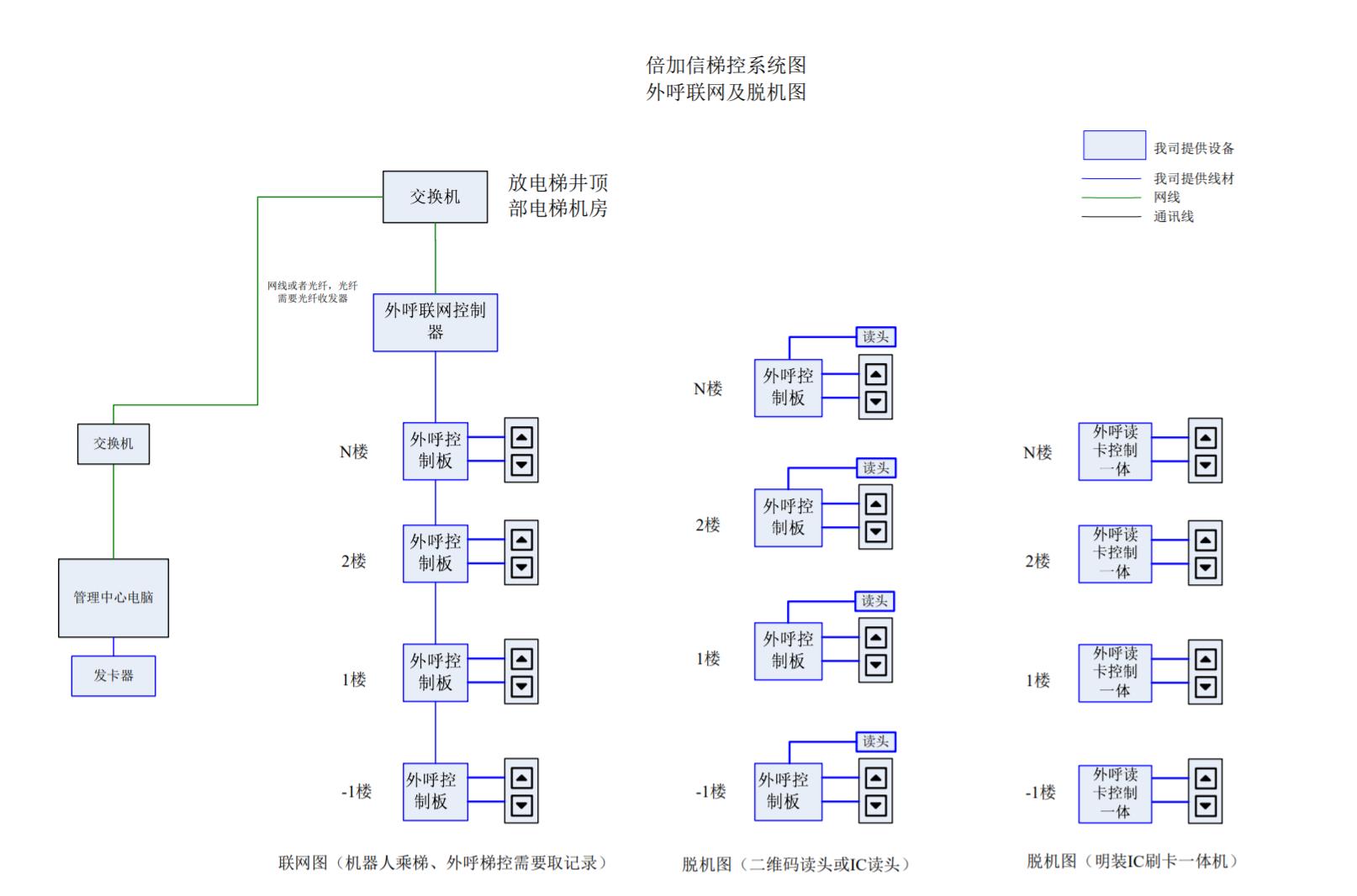 C. 如果是机器人乘梯,则不需要刷卡读头,直接外呼梯控控制板即可,还需要倍加信外呼联网控制器,与机器人联网通讯;